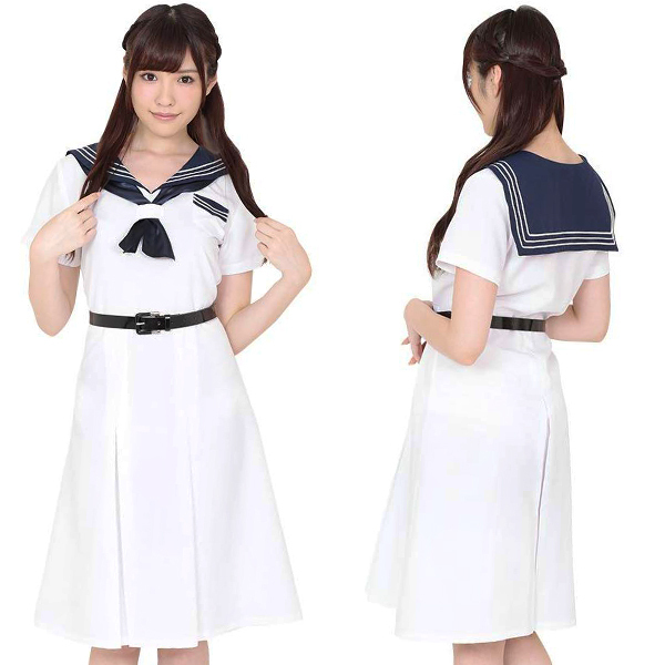 純白カラーが眩しい、清潔感と可愛らしさを見事に演出できる紺色のセーラー襟がついた制服コスプレです!白を基調としたワンピースは膝下ぐらいまであるので控えめで清楚なイメージを与えてくれます。