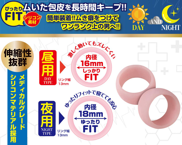 内径サイズの異なるシリコン素材のリングが2本ついているので自身のサイズやシーンに合わせて使い分けられる!ムき癖をつけてワンランク上の男へ…いざ、未知なる世界へ!<昼用タイプ>激しく動いてもズレにくい!しっかりフィットタイプ!<夜用タイプ>寝たまま付けても安心。