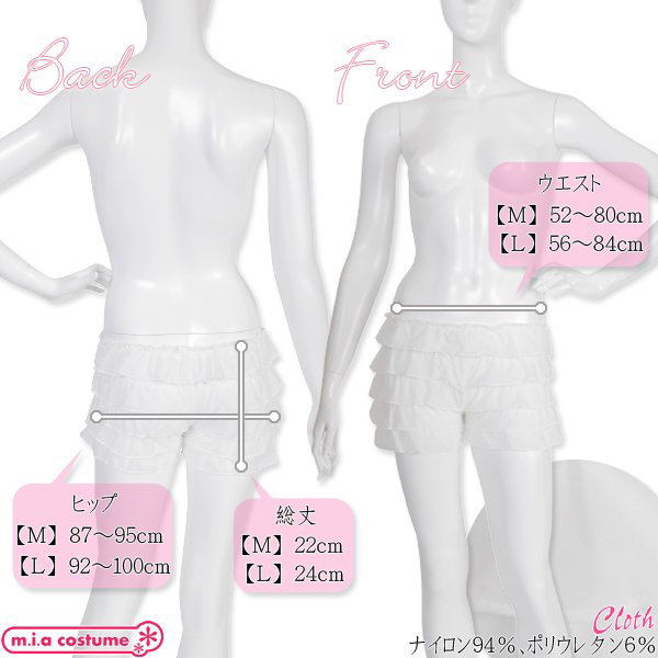 Lサイズ W56〜84cm・H92〜100cm・総丈24cm セット内容:ペチコートパンツ単品(ウエストゴム) 素材:ナイロン94%、ポリウレタン6% モデル身長162cm